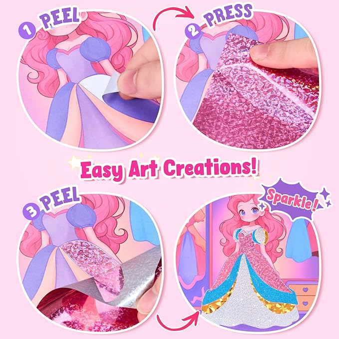 - Sparkling Craft Art, Easy to Create Stunning Princess and Magical Pony Effects: Craft is simple yet incredibly fun! Simply peel away parts of the design to reveal the sticky surface, apply the sparking pieces, then gently peel it off to reveal a dazzling princess artwork. Not only will kids experience the joy of success, but they will also improve their focus and fine motor skill from this craft activity. The vibrant princess-themed artwork will leave kids proudly showcasing their creations