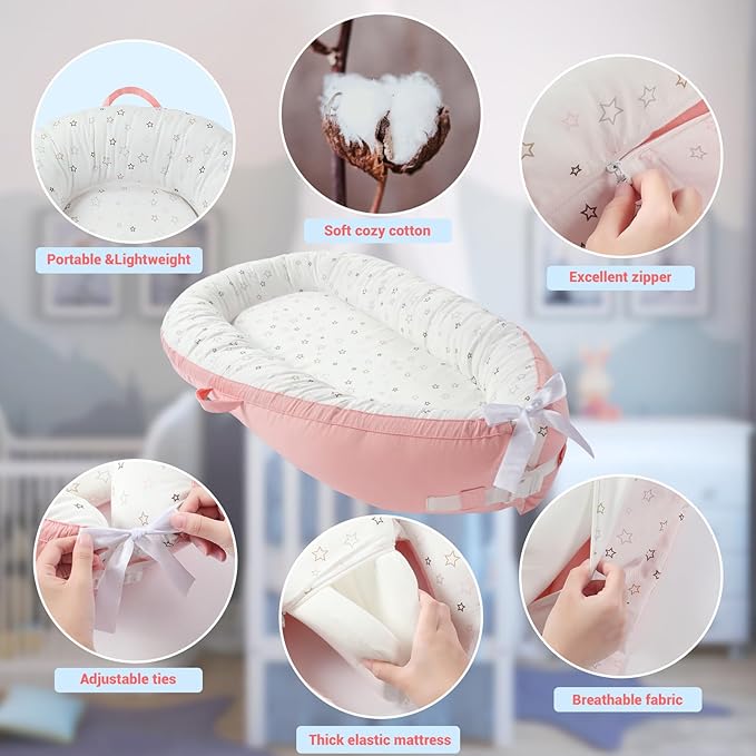 - 【Double-side Use & Adjustable】 Our baby lounger offers a double-sided design with different colors, allowing you to change either sides you want. Both sides are made of high-quality cotton fabric that is soft and skin-friendly. Also, it is easy to clean in a washing machine. Additionally, this lounger features an adjustable bow tie that allows you to customize the size and shape of the lounger, making it suitable for babies aged 0-24months.