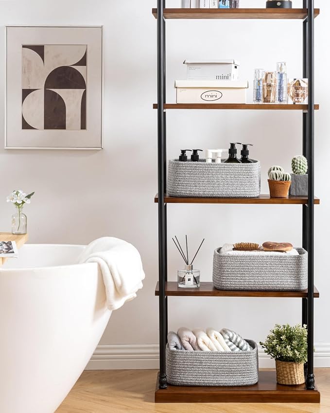 - [ Elegantly Designed to Match Any DΓ©cor ] Our small rope basket creates a minimalist appearance, and it adds a touch of warmth and texture to any room. The classic solid color design ensures seamless integration with your existing aesthetics, complementing any decoration. Perfect as decorative storage baskets for shelves, cabinets, and any open display space, making them a stylish and practical addition to any decor, enhancing the overall aesthetics of your room