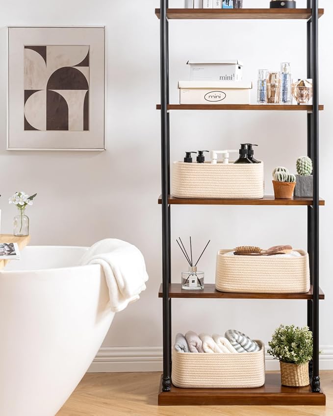 - [ Elegantly Designed to Match Any DΓ©cor ] Our small rope basket creates a minimalist appearance, and it adds a touch of warmth and texture to any room. The classic solid color design ensures seamless integration with your existing aesthetics, complementing any decoration. Perfect as decorative storage baskets for shelves, cabinets, and any open display space, making them a stylish and practical addition to any decor, enhancing the overall aesthetics of your room