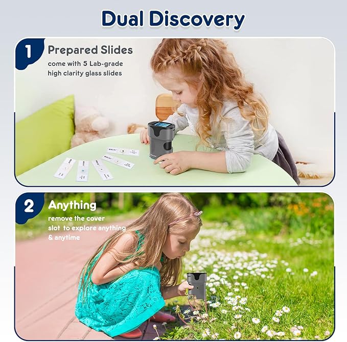 - Portable Pocket Microscope: This kids microscope weighs only 0.34lbs and 4*3*1.8 inch in size. it is small enough for your kids pocket or bags sacks, it come with a thickened neck strap to free your hands while running.
