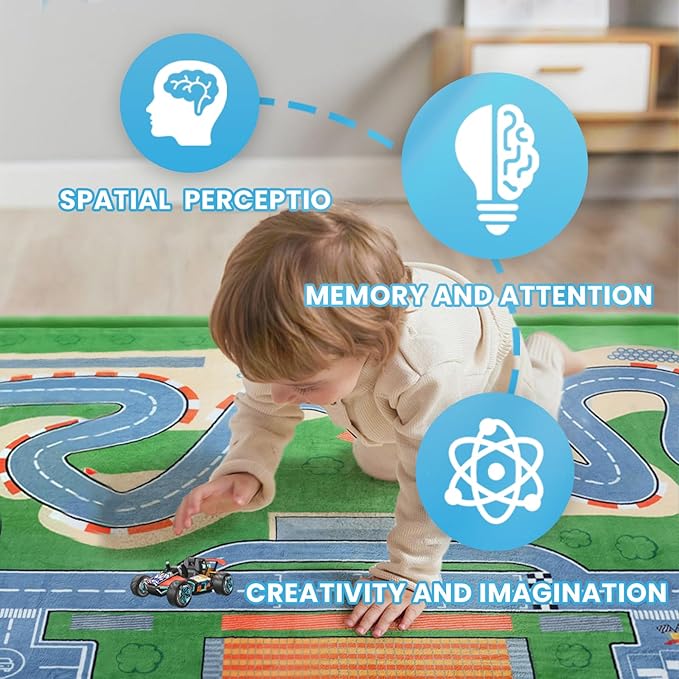 - Fun Educational Race Track Design: This vibrant car race track rug stimulates imagination and learning. Perfect as a classroom rug or playroom rug, it helps develop spatial awareness and creativity in toddlers and young children