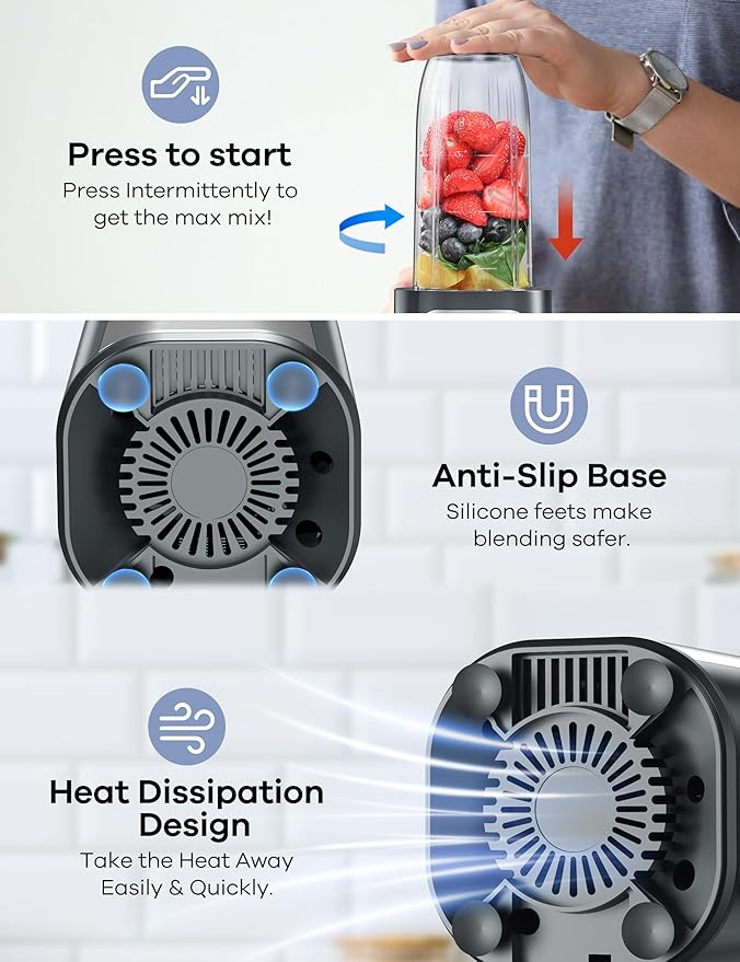 - LARGER CAPACITY & PORTABLE DESIGN: The personal blender features one 24oz and two 17oz blender cups and two to-go lids, add extra portability for carrying to the office, gym, class, car, or in your bag. All parts are No-BPA to ensure healthy drinking.