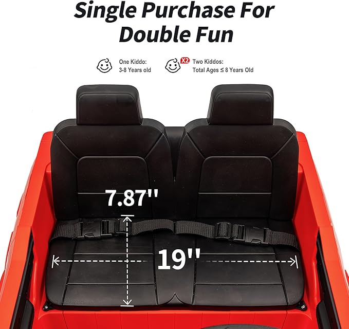 - 19" WIDE TWO SEATER: This 24V battery powered police kids car has ample seater, allowing two children to ride together comfortably under 110lbs. Adjustable seat belts and double-locking door design also ensure kid's safety.