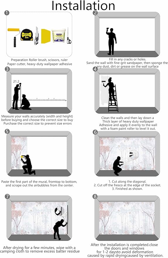 - Installation Steps1. Fill in any cracks or holes and clean the surface of the wall of dust, dirt and grease.2. Apply heavy-duty wallpaper paste to the wall, not the mural.3. Mark the position of each strip of wallpaper with a spirit level.4. Align the pattern and slide it into place.5. Scrape the bubbles with a spatula.6. Let it dry for a couple of minutes and it's ready to go!