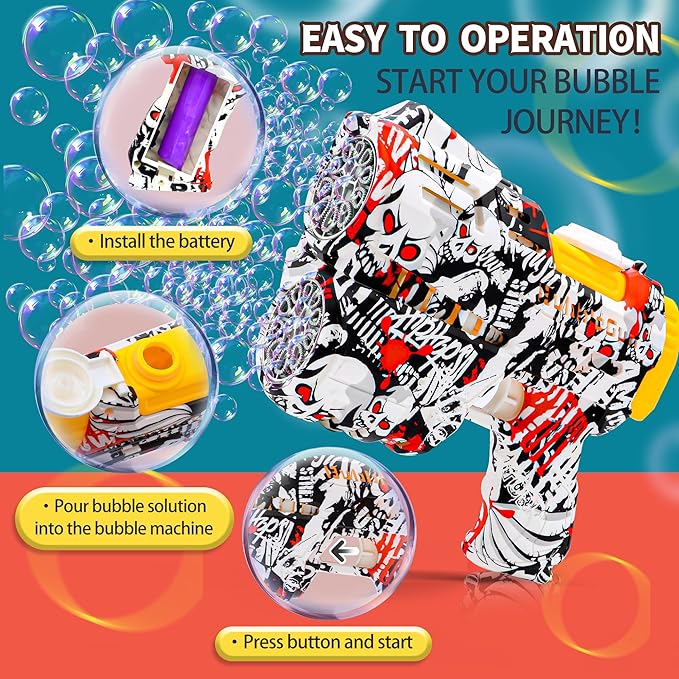 - Ideal Gifts for Any Occasion - The toddlers bubble maker comes in a beautifully packaged box with complete accessories . It is the perfect gift for kids toddlers over three years old. The bubble gun blaster also makes a great bubbles toy bag for these indoor and outdoor occasions, perfect for theme parties, carnivals, birthday parties, camping trips, Halloween, weddings, school classrooms, Easter baskets, outdoor water toy play activities, beaches, backpacking, backyard Bubble party etc.