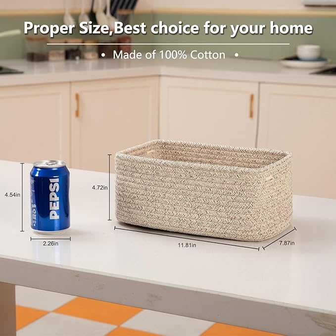 - [Cute & Small Decorative Storage Baskets]: These 4 Pack woven baskets measuring 11.81” x 7.87” x 4.72”, the fantastic woven rope baskets with mini size, which can work as shelf baskets for organizing, cute and practical for home decor, making your home more cozy and attractive