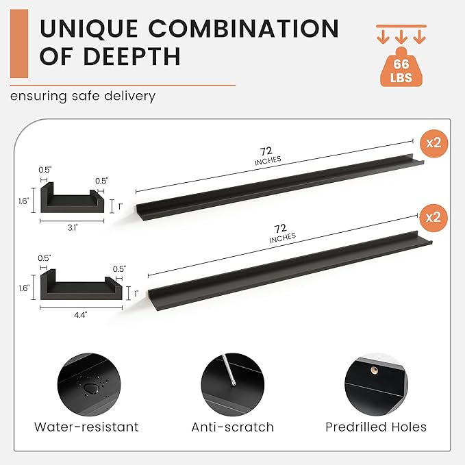 • 【Picture Ledge Perfect for Display】FLYJOE picture ledge shelves for wall turn your walls into a stunning photo gallery! These spacious shelves are ideal for showcasing a variety of picture frames in one secure place. With a thoughtful protective lip, you can display everything from photos to collectibles without worrying about them falling off