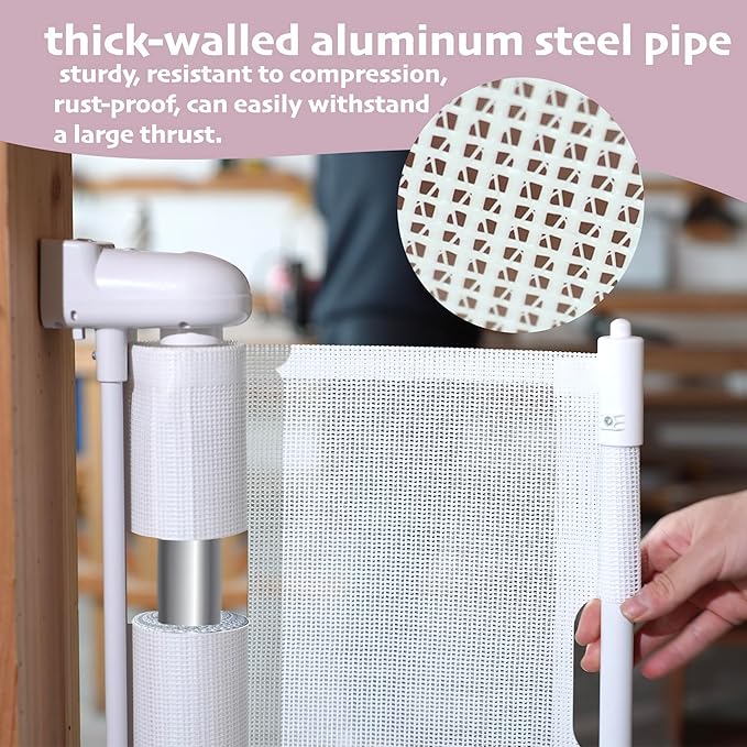 - Safety Double Lock Design - The retractable gate features two locking mechanisms: a mesh lock that controls the mesh's extension and retraction, and a hidden door lock for opening and closing the gate. Designed for adult convenience, it remains particularly challenging for children, effectively preventing them from opening the door alone and accessing hazardous areas.