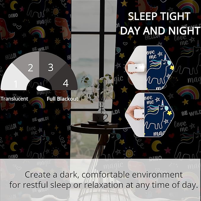 100% Blackout Curtains for Kids - Adorable Dinosaur & Unicorn Pattern, 2Panels, Each W52xL84, Thermal Insulated Noise-Reducing Drapes for Nursery, Bedroom, Playroom - Fun & Colorful Design