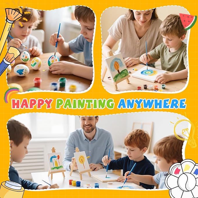 - 【 Mini stretched canvas and easel】: The 16 set mini acrylic paint set provide 5 x 5 inch small canvas with 7.5 inch mini wooden display easel. Kids can show their creations anywhere. Our mini canvas are safe and non-toxic, making them perfect for kids to use. These small easels are sturdy,can be used to hold photos, phones and more.