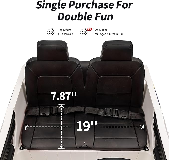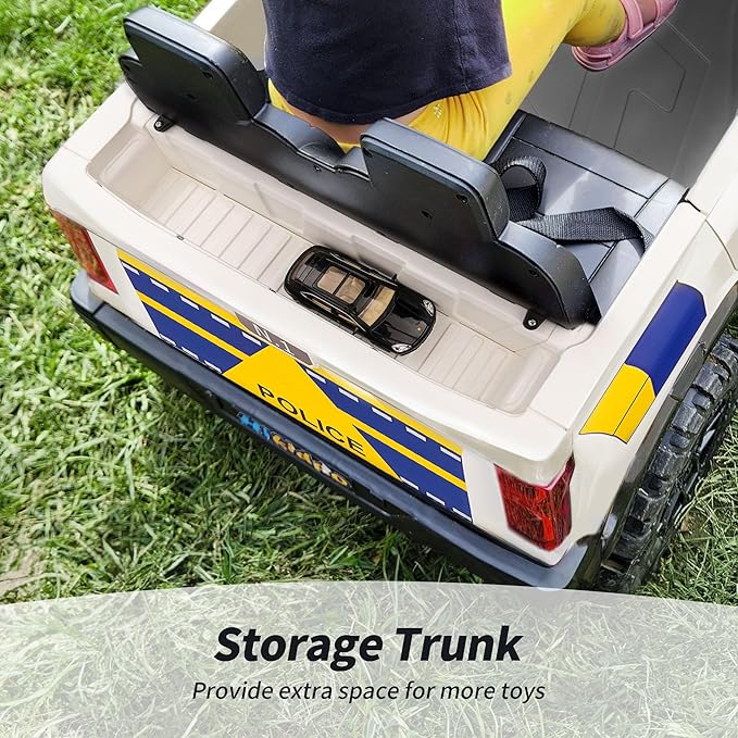 - 19" WIDE TWO SEATER: This 24V battery powered police kids car has ample seater, allowing two children to ride together comfortably under 110lbs. Adjustable seat belts and double-locking door design also ensure kid's safety.