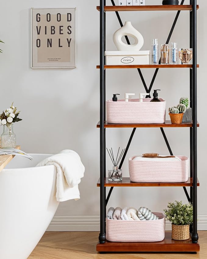 - [ Elegantly Designed to Match Any DΓ©cor ] Our small rope basket creates a minimalist appearance, and it adds a touch of warmth and texture to any room. The classic solid color design ensures seamless integration with your existing aesthetics, complementing any decoration. Perfect as decorative storage baskets for shelves, cabinets, and any open display space, making them a stylish and practical addition to any decor, enhancing the overall aesthetics of your room