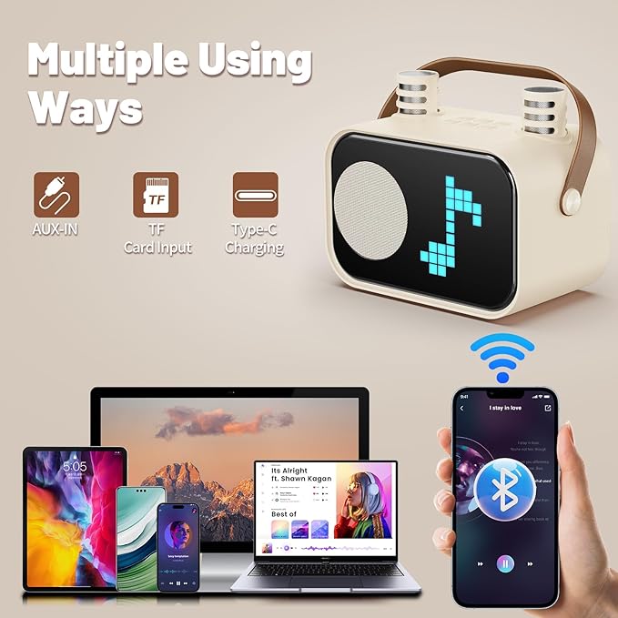- 🎤【Dual Wireless Mic All-in-One Karaoke System】This portable karaoke machine has a compact design with built-in mic slots and a reinforced strap—perfect for impromptu sing-alongs at picnics, vacations, or home parties. Let kids become instant superstars wherever they go!