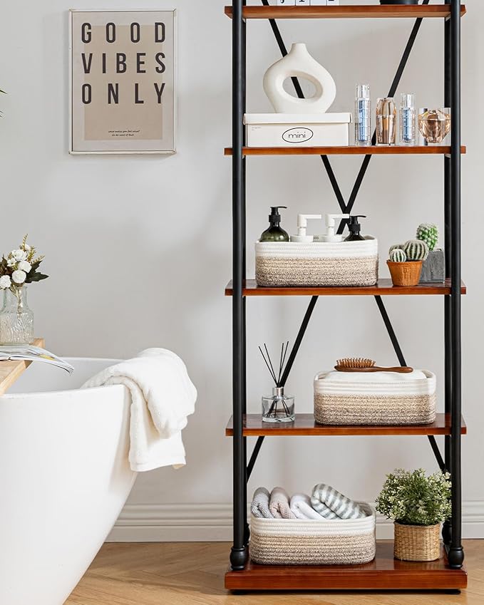 - [ Elegantly Designed to Match Any DΓ©cor ] Our small rope basket creates a minimalist appearance, and it adds a touch of warmth and texture to any room. The classic solid color design ensures seamless integration with your existing aesthetics, complementing any decoration. Perfect as decorative storage baskets for shelves, cabinets, and any open display space, making them a stylish and practical addition to any decor, enhancing the overall aesthetics of your room