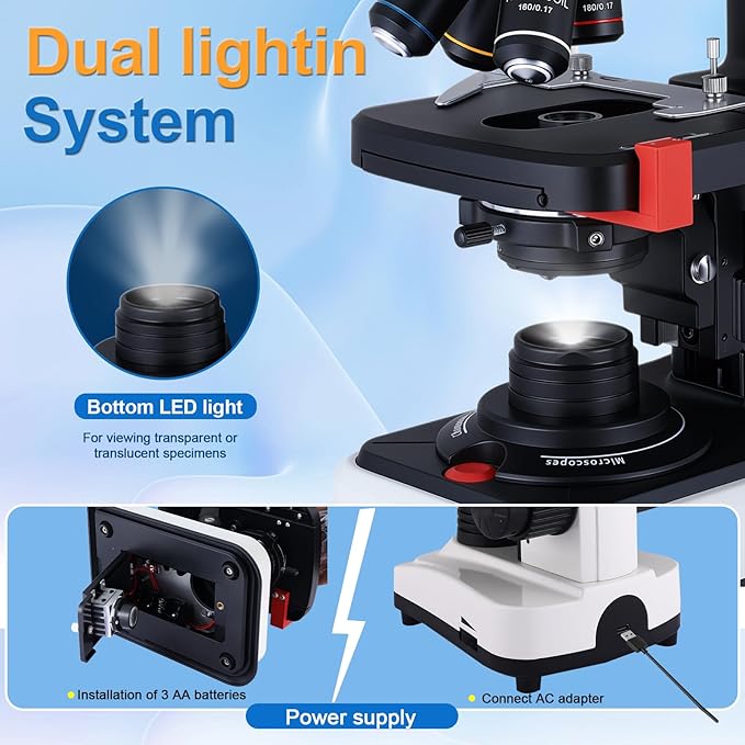 - 【Advanced Optics】:Multi-microscope is equipped with 4X, 10X, 40x and 100X objective lenses 25x wide angle eyepieces, offering a wide range of magnification choices up to 2500X magnification, precision grounded optics and high-quality glass lenses to provide clear and vivid images