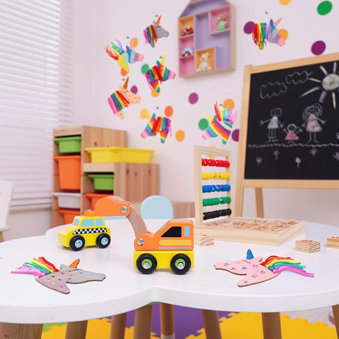 - 24 Set Wooden Unicorn Cutout Kit: unleash your imagination with this complete wooden unicorn craft kit; It includes 24 unfinished unicorn cutouts, 2 sets 12 color paints, 4 paintbrushes, 8 rolls of yarn in different colors, ready to be transformed by your creativity