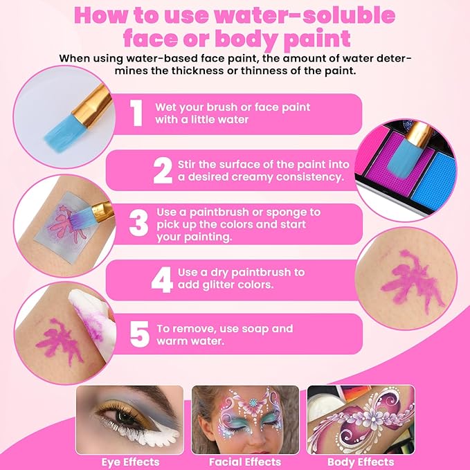 - 【Applicable For Multiple Parts】- It can be widely used on the face, hands and other parts of the body to create a comprehensive face and body painting experience for you. This water-soluble face paint is easy to use—just mix with water! Dilute for a thinner consistency to cover larger areas, or keep it thick for smaller, precise applications. Even if you’re not a professional face painter, you can quickly learn by following our instructions.