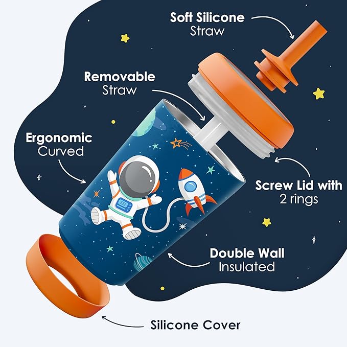 Kid Insulated Stainless Steel Tumbler with Silicone Straw, 12oz Sippy Cup for Kids (Astronaut)