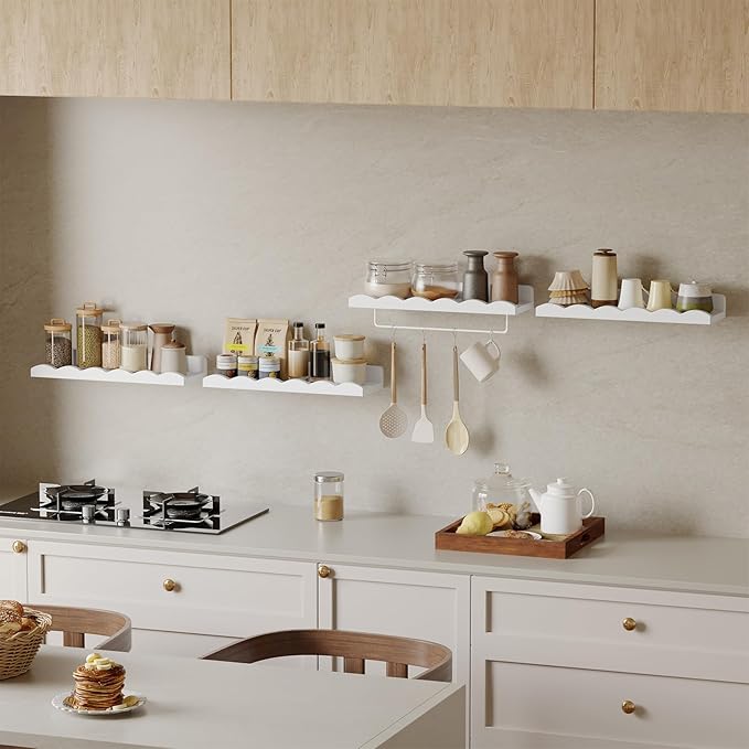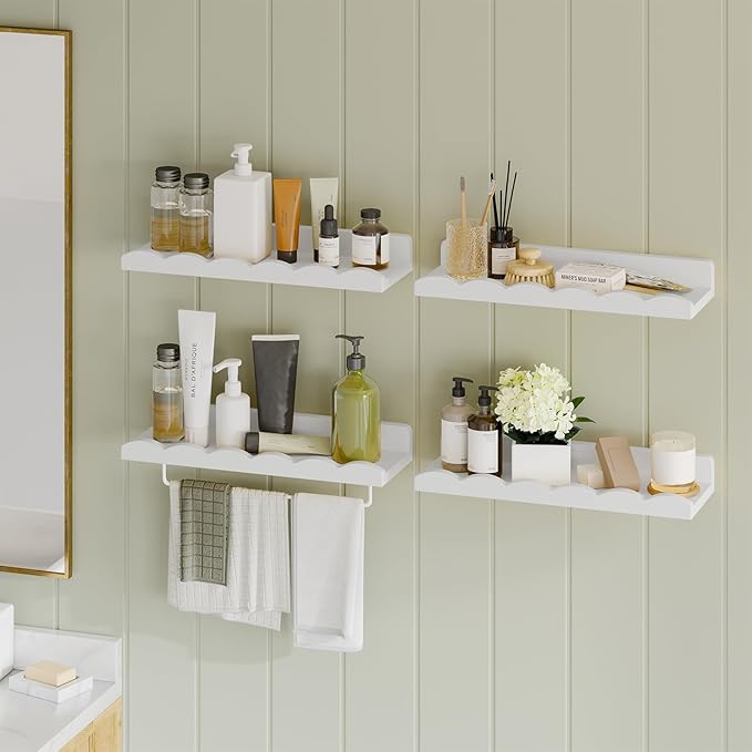 Fixwal Nursery Shelves, 16.5 Inch Floating Bookshelves for Wall Set of 4, Scalloped Wall Book Shelves with Towel Rack for Kids, Toddler Room, Baby Room, Nursery Decor and Storage(White)