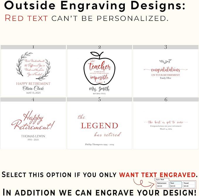 - Customizable: this acacia retirement box for memories can be engraved with various designs offered adding the name, retired date to make it unique. Weโll use the font style showcased in the photos. Additionally, it can be engraved inside(different font options), on the other lid's side, to create a surprise message for the recipient