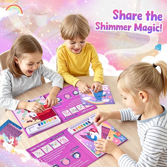 - Sparkling Craft Art, Easy to Create Stunning Princess and Magical Pony Effects: Craft is simple yet incredibly fun! Simply peel away parts of the design to reveal the sticky surface, apply the sparking pieces, then gently peel it off to reveal a dazzling princess artwork. Not only will kids experience the joy of success, but they will also improve their focus and fine motor skill from this craft activity. The vibrant princess-themed artwork will leave kids proudly showcasing their creations