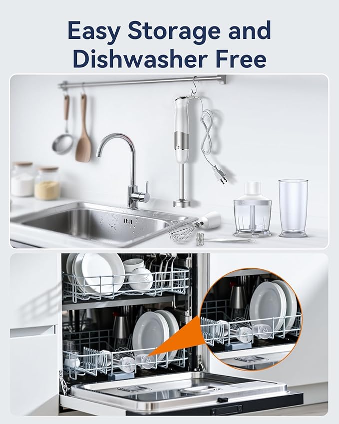 - Easy to Clean: The snap-on/off detachable attachment design makes this emulsifier blender easy to connect and disconnect and a breeze to clean as they all comes off easily than a regular blender. You can just rinse it off after use or wash it in dishwasher. It can hang with the hook and the main body can easily be cleaned by wiping with a soft damp cloth. (except blender shaft and chopping bowl lid requires hand wash and the water temperature of the dishwasher should be below 75Β°).