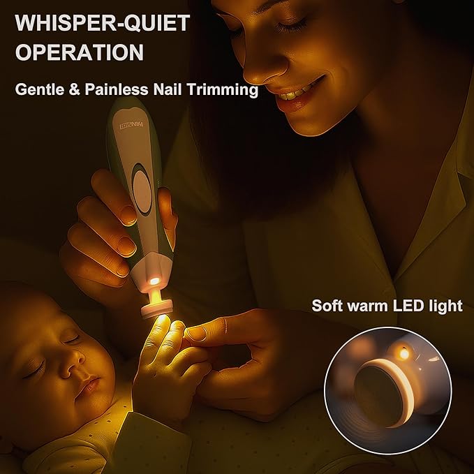 - Safe & Silent with LED Light – Fansidi nail trimmer is built in a gentle low-noise motor, under 35dB working noise, and touch-and-stop function prevents injuries from accidental hand tremors of parents. Soft warm LED night light makes nighttime trimming easier and safer.