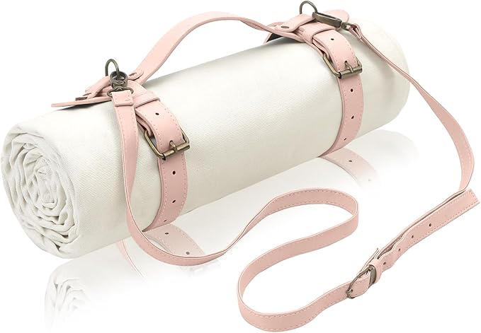 - Includes: 1 white canvas mat, faux leather handle/should strap, and webbing strap