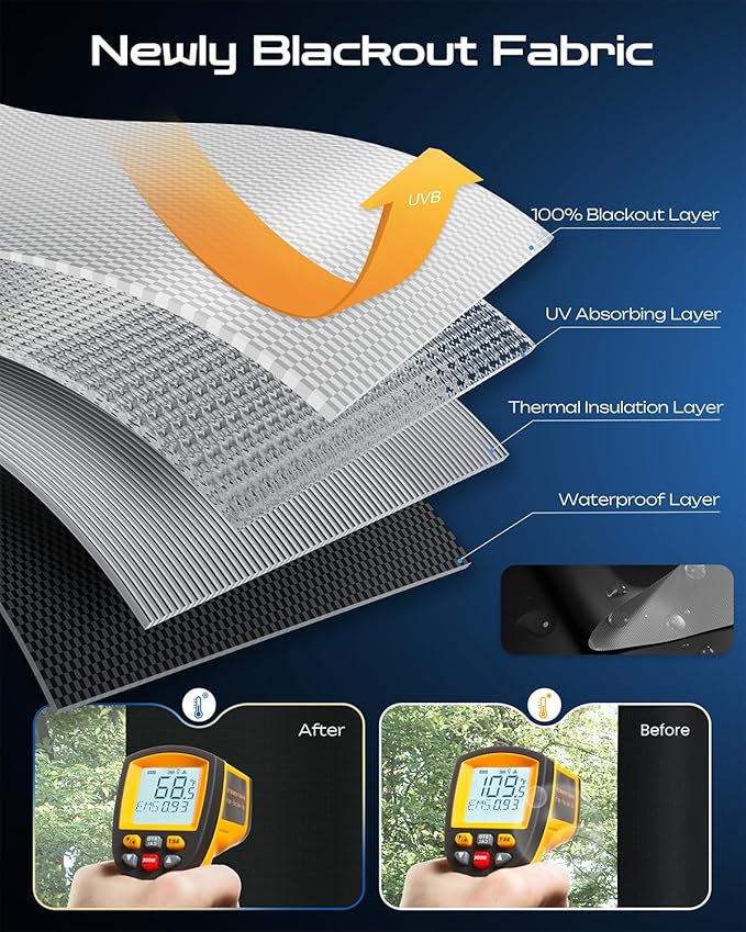 - 100% Blackout - Made of ultra-dense triple-layer polyester fabric and integrated with innovative nano-coating technology, these blackout blinds block all sunlight, UV rays, and artificial light sources. The innovative coating reflects 90% of heat, ensuring a cool environment while creating a pitch-black space. They are ideal for shift workers, nurseries, and those prioritizing privacy, as they transform any room into a serene, light-free haven