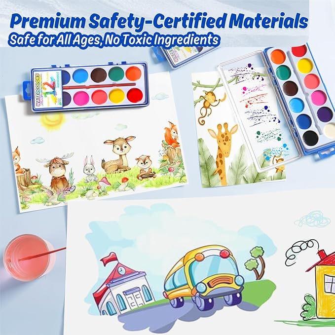 - Value Watercolor Paint Set: The Watercolor Paint Set Bulk includes 24 boxes, each containing 12 vibrant colors and a brush, making it perfect for classrooms and group activities. Kids can easily mix colors to explore their creativity and bring their art to life!