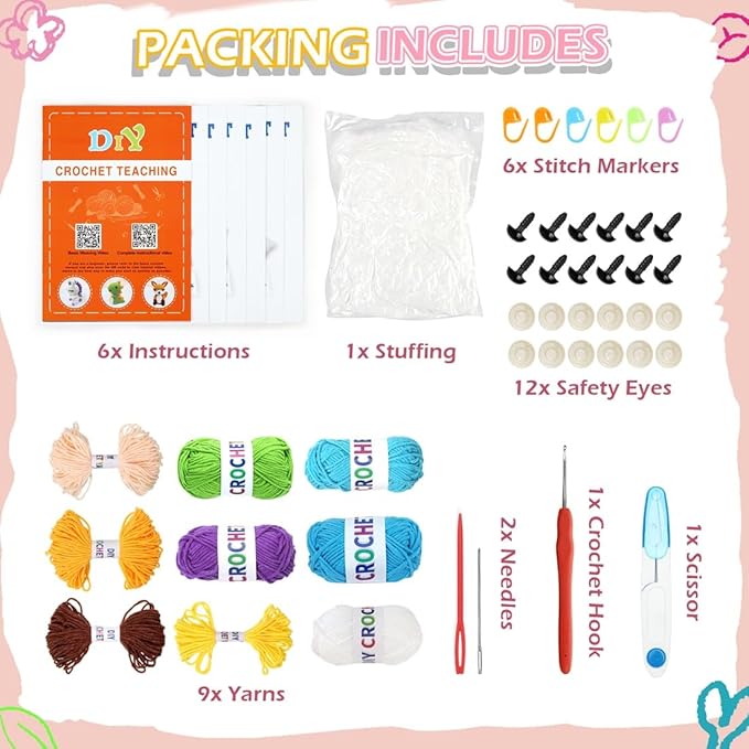 - 【ALL IN ONE CROCHET KIT】: Along with Easy Yarn and easy-to-follow video tutorials, you'll receive every other tool you'd need to begin crocheting with our kits. The beginner crochet kit also includes a scissors, a crochet hook, 2 needles, eyes, 6 marker buckles, cotton stuffing, 6 written crochet patten instructions and video tutorials.