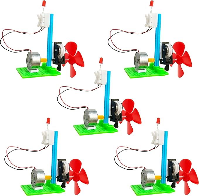 - Each kit features a DC motor, fan blade, LED light bulb, and simple connection components.