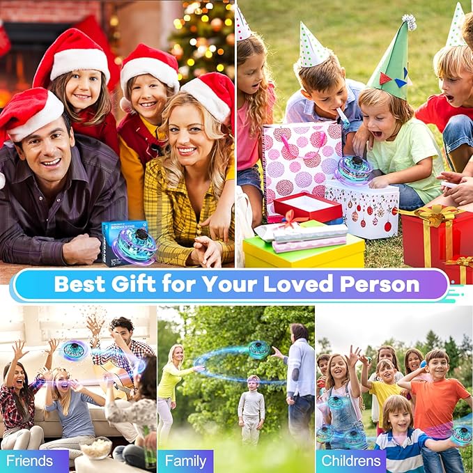 - 😊【FUN and SIMPLE UFO DRONE FLYING TOY】Turn on the power button of flying toys,hold down the center axis to rotate the wheel to start,then throw it away and fly.Different throwing speeds and angles allow different flight paths,tricks,and high-speed maneuvers.Stop the flying by grabbing the mini drone with your hand.You can have fun with friends, family,colleagues indoors,outdoors,at school and in the office.Hover toy is a popular social game at birthday parties,family gatherings.