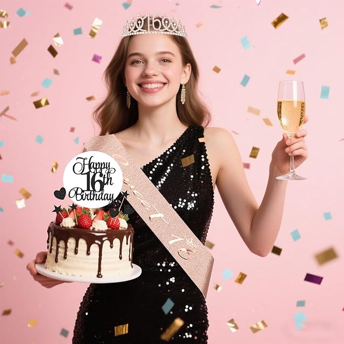 - 16th Rhinestone Crown & Sparkly Sash: The birthday sash, made of soft fabric via hot-press stamping glitter technique, features superior quality with non-shedding glitter and rose gold Sweet 16 birthday letters. The crown, crafted from sturdy hard alloy with dazzling rhinestones, is meticulously designed for 16th birthday parties.