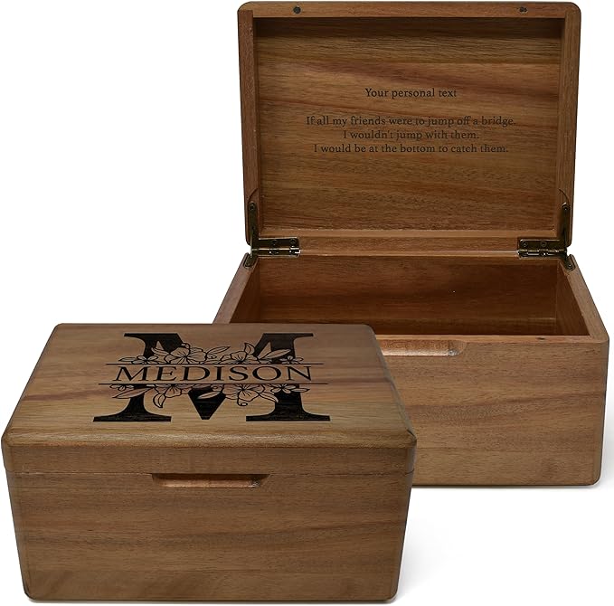- Customizable: this acacia wooded keepsake box can be engraved with various designs offered create your own memory box by adding a name or family name to make it unique. Weโll use the font style showcased in the photos. Additionally, it can be engraved inside(different font options), on the other lid's side, to create a surprise message for the recipient